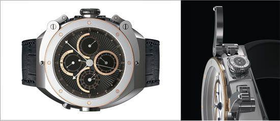 这只非凡的工具有两个世界第一:全新利用秒表的方式,有先进的开始和中止秒表功能的技术解决方案,并能对操作秒表提供全方位保护;另外,这也是第一个全球限量生产的有真正月球成分的手表。这块来自月球的陨石在九点钟位置的舷窗里呈现出来。