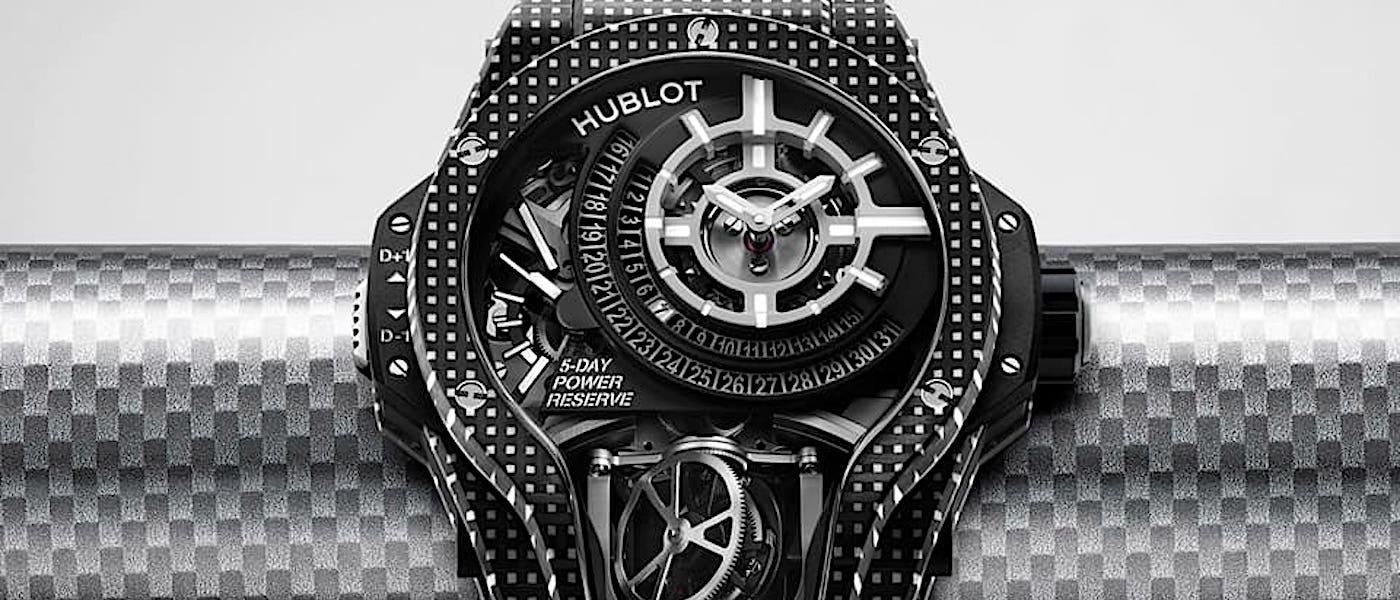 白色3D碳纤维材质/HUB9009.H1.RA.B手动上炼机芯/时、分、小秒、日期显示/陀飞轮装置/动力储存显示/蓝宝石水晶镜面/防水30米/表径49mm/限量8只/参考价:¥ 1,409,750