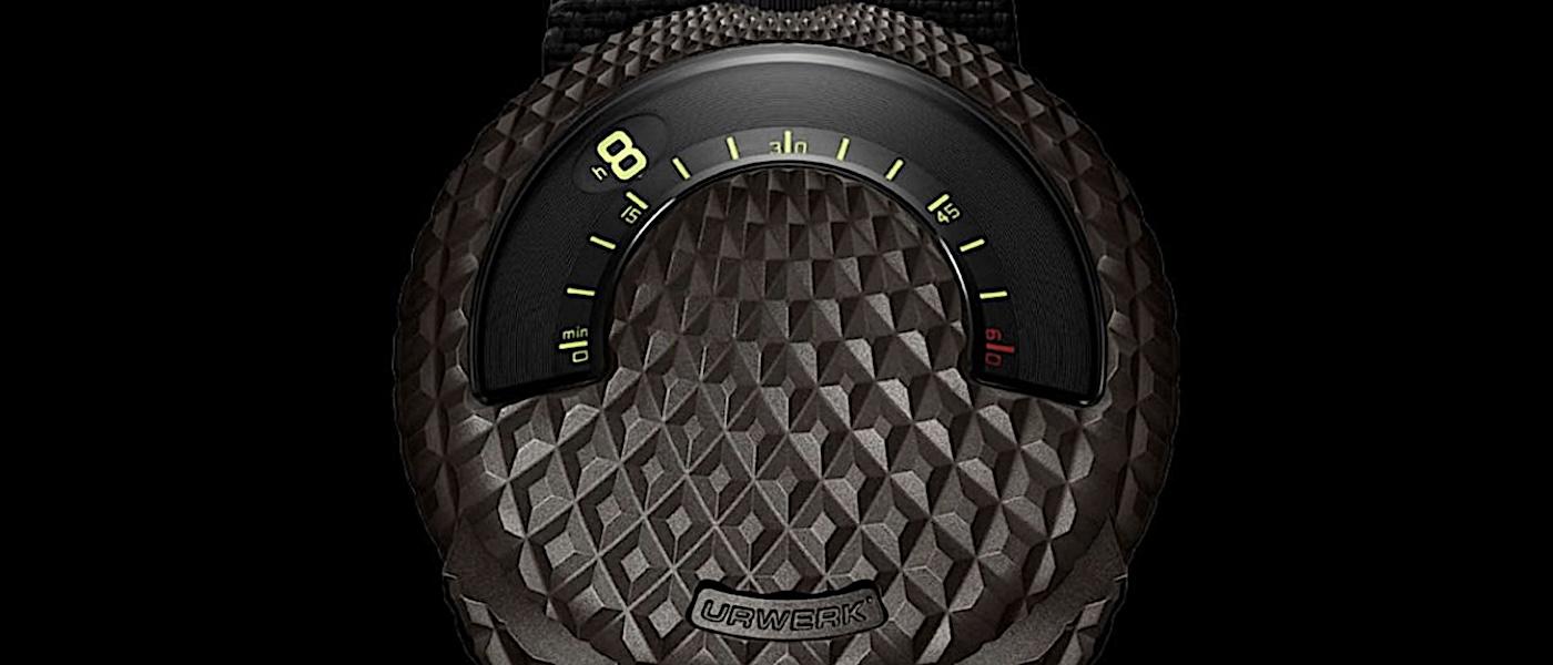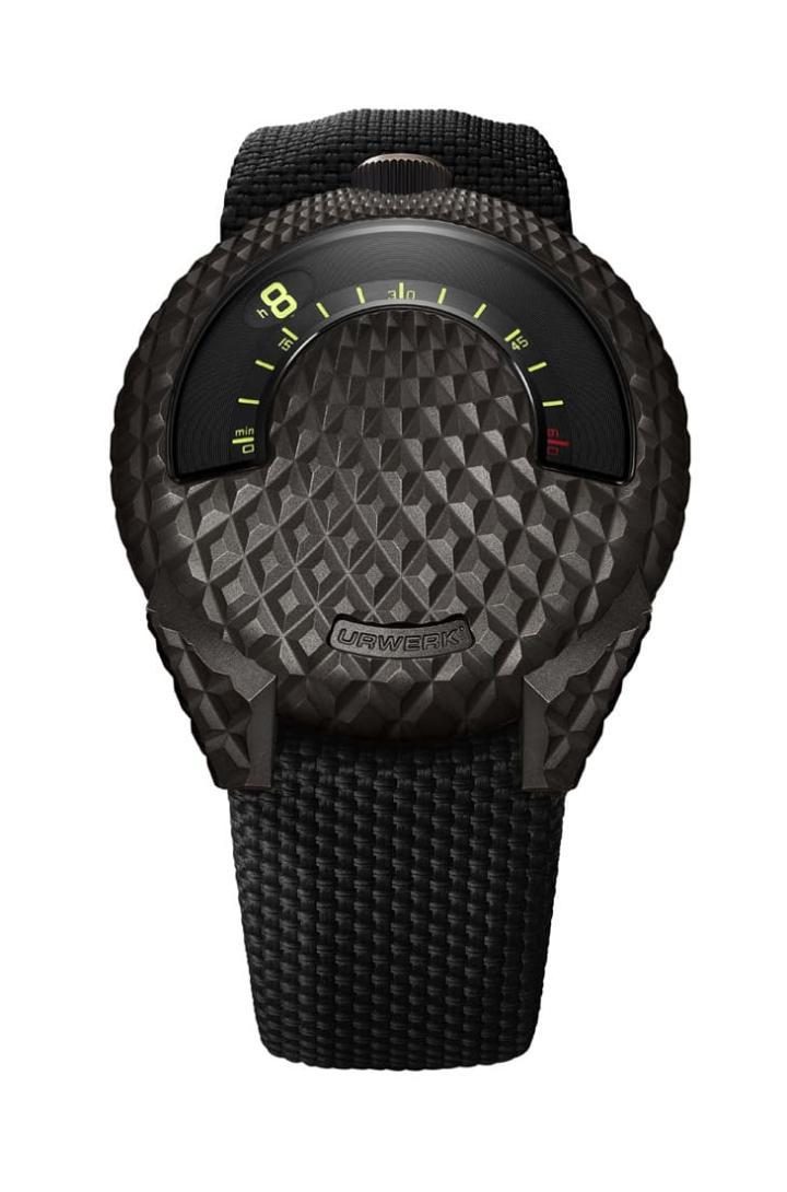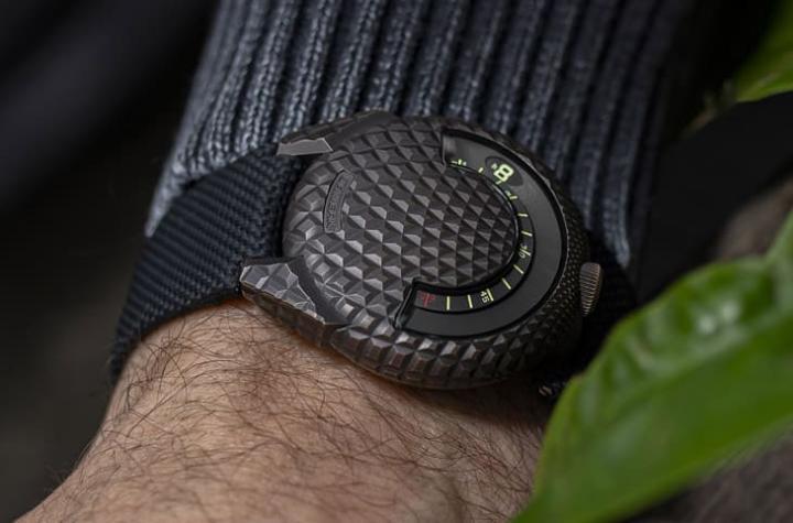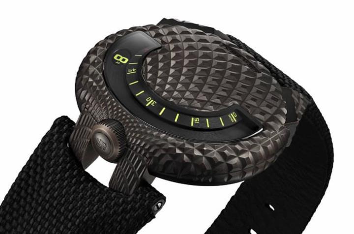 UR-101 T-Rex的奇特表壳稍微有点转移它同样很特殊的显时系统的光芒,其正面的180度弧形视窗露出卫星小时转头和一个蜗形卡罗素装置,当小时转头随着时间前进的同时,它便能够配合下方的刻度同时指示分钟,别出心裁的设计阅读时直觉易懂,即使不是采用传统指针设计,还是维持了清楚的显时作用。
