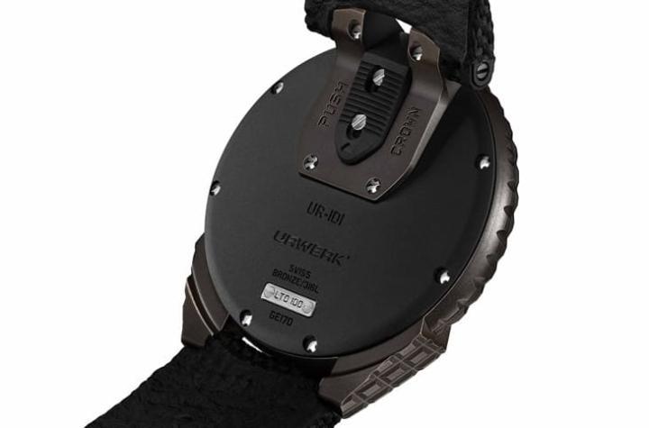 手表背面可见黑色PVD的不锈钢实底盖,同时推动表冠的装置附近也刻上说明文字协助佩戴者快速弄懂手表的巧思,底盖下缘镶有一枚小小的金属铭牌,上面刻了手表的限量数,强调其珍稀的收藏价值。而在表壳内部的UR-1.01V自动机芯规格中规中矩,如摆轮震频4Hz、动力储存48小时等,顾及走时的精确度以及一定的实用性,它一方面奠基于URWERK原创的卫星漫游小时概念,但是设计上愈趋成熟,例如不一定非要露出完整的卡罗素装置,面盘视窗方向也不一定要朝下,从中展现出设计与制表工艺工艺持续精进的水准。