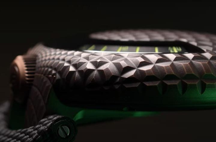 手表以青铜材质为主,并搭配黄铜与ARCAP P40合金等材质制作成41mm的表壳,URWERK透过机刻工艺,在表圈、表侧以及表耳覆盖机刻鳞状纹,后续要再经过氧化处理以及磨砂修饰,如此一来,手表戴得愈久,它的棕色色调会愈来愈明显,但不会生成绿色的铜锈,这是UR-101 T-Rex和一般青铜表不同的一大特色。