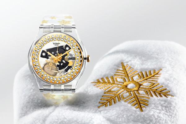斯沃琪(Swatch)圣诞特别SNOW YOUR TIME AWAY腕表能当地起对圣诞的期待,这款腕表的灵感来波光粼粼的雪景,表盘四周被一圈耀眼的金色包围。