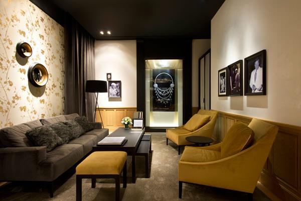 致力于让顾客享受全面的个人购物体验,伯爵于店内特设独立的奢华贵宾会客室。会客室内墙面悬挂着伯爵家族及多件极具纪念价值的物品图片,如同一个艺术博物馆,生动述说着伯爵的辉煌时刻与它的标志性创作,使访客收到品牌盛邀般置身尊贵奢华、瑰丽迷人的购物环境,深入伯爵品牌一赏究竟。皮革及橡木制成的桌子、金色及烟灰色大型帘幔,与黑漆、绿锈色、微微闪烁珠光的地毯,营造出愉悦、奢华的环境,让每一位访客沉溺在伯爵尊贵荣耀与艺术之美相互辉映的轻松氛围中。