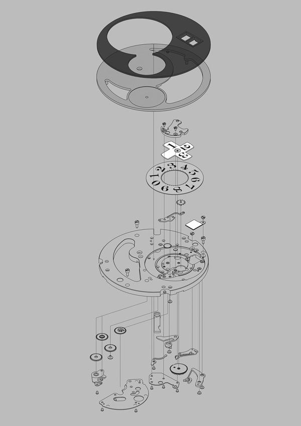 朗格大日历显示的设计灵感,源自1841 年费尔迪南多.阿道夫.朗格(Ferdinand A. Lange)为德累斯顿森帕歌剧院制造的五分钟数字钟。为使用更大的日期格式,日历装置如同其典范之作般采用两个独立的显示元素:配备0至9 数字的环状个位数字盘每日前进一格。只有由31 日过渡至1 日时,个位数字盘才会在当天静止不动。具有1至3 数字及白色空白格的十位数交叉盘每十天才前进一格。当显示为3 时,十位数交叉盘即会在2 天后前进至空白格。此不规则的切换顺序全由两个具备精准计算齿轮列的程序齿轮所控制。