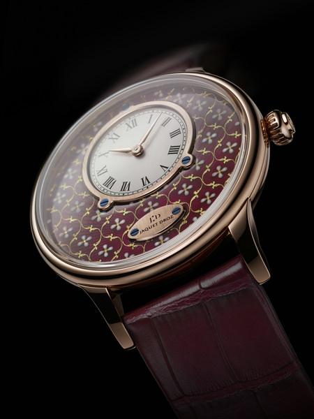 在1000度高温炉火中煅烧而成的大明火表珐琅盘素以温润饱满的色泽,亘古不变的品质成为雅克德罗精湛技艺演绎之典范。在表盘烧制成半成品时,制表大师将纤细于毫发的金箔叶迅速安置于半透明珐琅上,排列成独特的花纹图案。这不但需要久经锤炼的深厚功力,更需要缜密精细的科学计算。金箔叶的超低熔点和需经千度煅烧的大明火珐琅,看似一对难以调和的矛盾体,却被雅克德罗神奇地结合在一起,成就稀世佳作。犹如华美绽放于表盘上的艺术之花,娓娓讲述古老工艺的璀璨史诗。