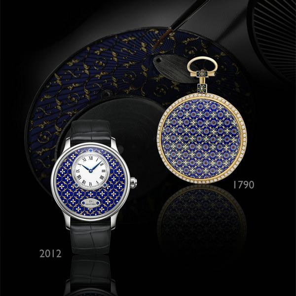 雅克德罗 Jaquet Droz 金箔雕花珐琅时分小针盘腕表,将来自18世纪的古董金箔叶点缀于大明火珐琅表盘之上,为这款腕表赢得“古董蕾丝”之美誉,亦成就了品牌PAILLONNÉ珐琅工艺之秘技。