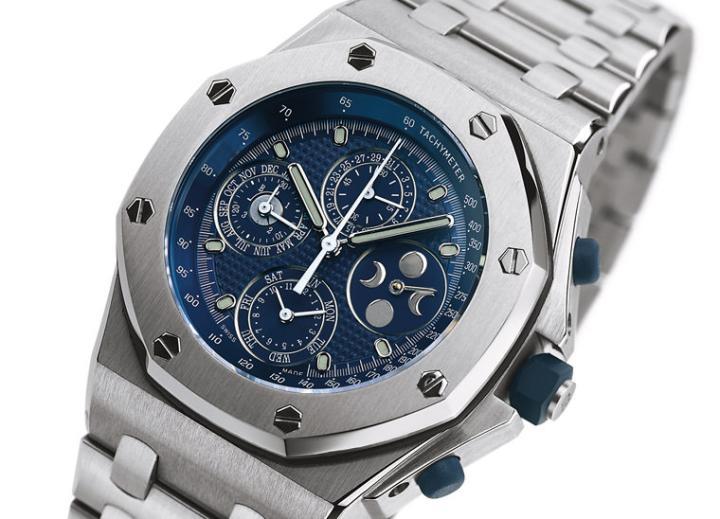 第一只皇家橡树离岸型腕表在全球掀起了大尺寸奢华腕表的流行风潮,奠定了表壳尺寸的新标准。蓝色\"Petite Tapisserie\"小格纹装饰面盘具有日期、小秒钟及计时功能显示,外圈配以测距仪刻度,采用抗磁表壳,防水深度达100米,搭载Calibre 2126/2840自动上链机芯。